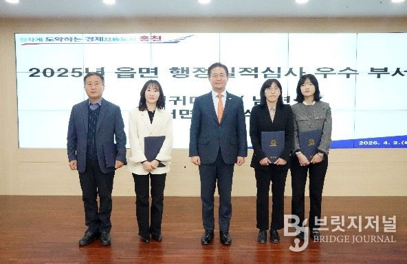 브릿지저널 윤나영 기자 | 홍천군은 4월 2일 홍천군청 대회의실에서 2025년 읍면별 군정 주요 업무에 대한 행정 실적 심사 우수 읍면에 상장을 수여했다.