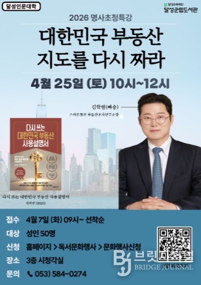 브릿지저널 김진석 기자 | 대구 달성군립도서관이 대한민국 대표 부동산 전문가 ‘빠숑’ 김학렬 스마트튜브 부동산조사연구소장을 초청해 특별 인문학 강연을 연다. 수강 신청은 오는 7일부터 달성군립도서관 누리집을 통해 선착순으로 진행된다.