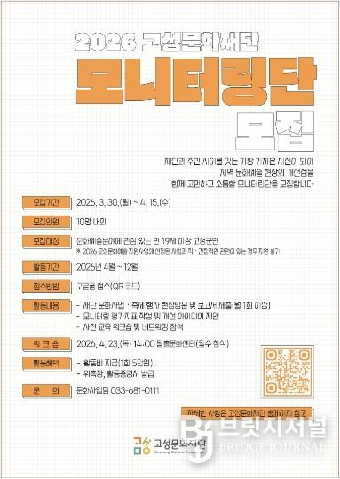 브릿지저널 윤나영 기자 | 평화 경제 거점 도시 강원 고성군 산하 고성문화재단은 재단이 추진하는 문화예술사업에 대한 군민 의견을 반영하고 사업 환류 체계를 강화하기 위해 ‘2026 고성문화재단 모니터링단’을 모집한다. 이번 사업은 군민 참여 기반의 현장 소통을 확대하고, 문화예술사업 운영의 투명성과 책임성을 높이기 위해 마련됐다.