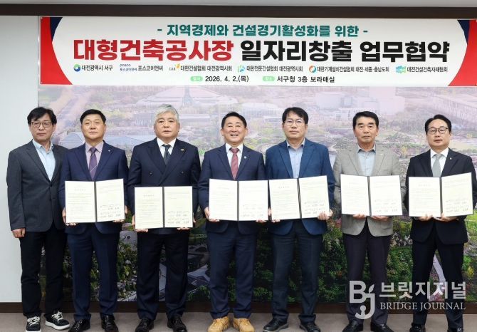 브릿지저널 정보영 기자 | 대전 서구는 침체된 건설경기 회복과 지역경제 활성화를 위해 구청 보라매실에서 관련 업체 및 협회들과 ‘대형 건축공사장 일자리 창출 업무협약’을 체결했다고 3일 밝혔다.