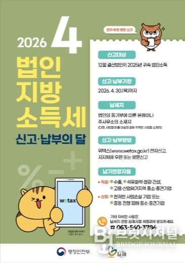 브릿지저널 윤나영 기자 | 김제시는 이달 한달 동안 2025년 귀속 법인지방소득세 신고·납부의무 법인이 성실하게 납세의무를 이행할 수 있도록 각 법인에 안내문을 발송하고 시청 홈페이지, SNS 게시 등 다각적인 홍보활동에 나설 예정라고 밝혔다.