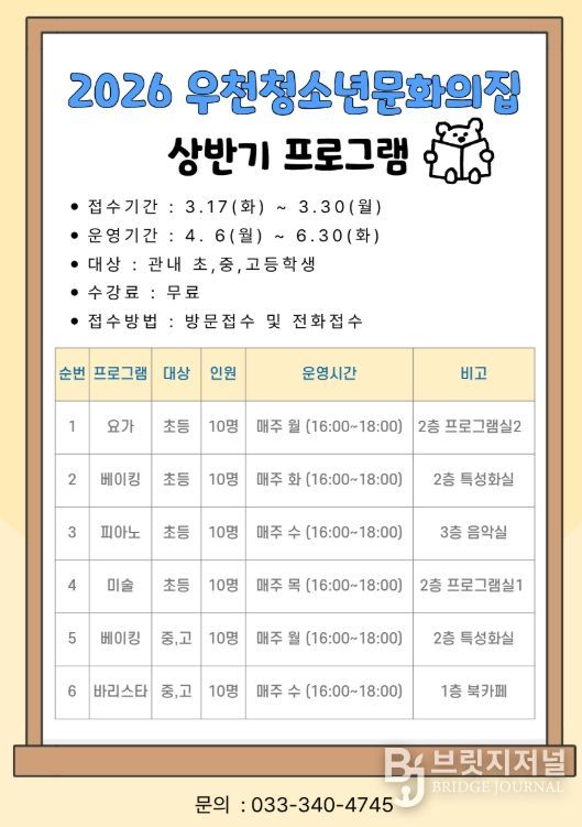 브릿지저널 윤나영 기자 | 우천청소년문화의집에서 우천 지역 청소년들을 위한 상반기 프로그램을 시작한다.