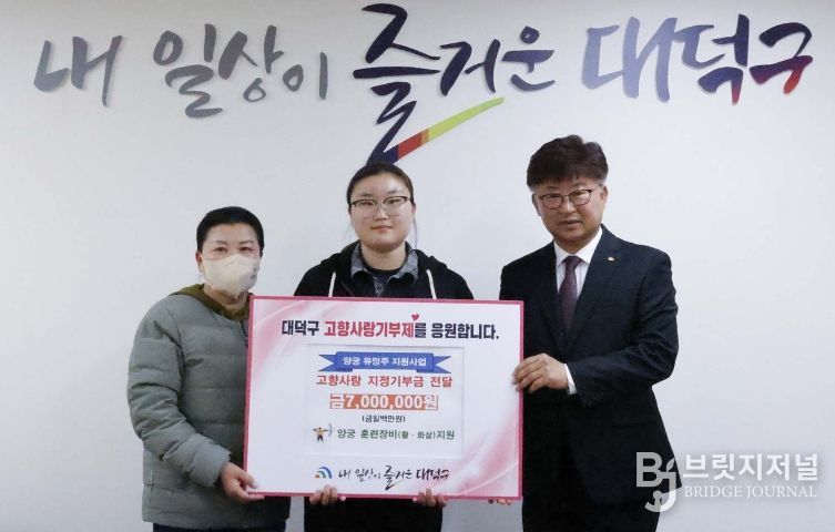 브릿지저널 정보영 기자 | 대전 대덕구는 6일 고향사랑기부제 지정기부사업으로 모금된 기부금을 지역 청소년 양궁 유망주에게 전달했다.