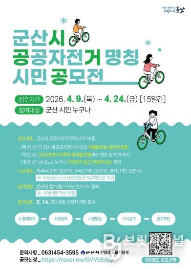 브릿지저널 윤나영 기자 | 군산시가 QR코드 방식의 공공자전거 대여·반납 시스템 개편에 맞춰, 시민이 직접 이름을 정하는 ‘공공자전거 명칭 시민 공모전’을 개최한다.