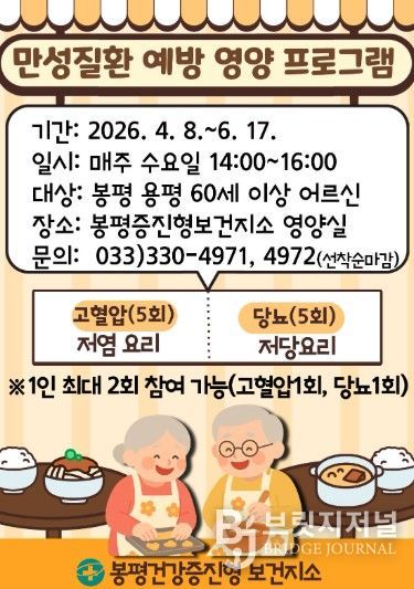 브릿지저널 윤나영 기자 | 평창군보건의료원은 4월 8일부터 6월 17일까지 매주 수요일 오후 2시부터 4시까지 봉평건강증진형 보건지소 영양교육실에서 봉평 권역(용평·봉평) 지역 주민을 대상으로 '만성질환 예방 영양 프로그램'을 운영한다.