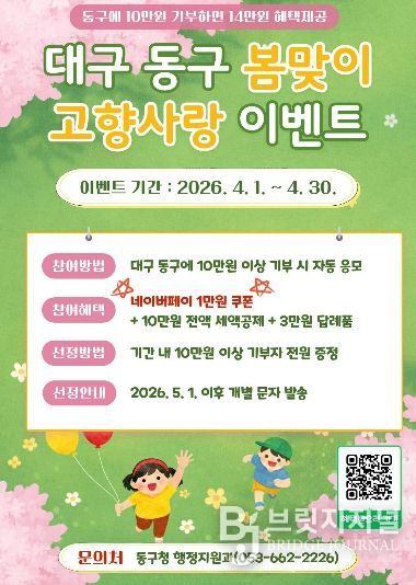 브릿지저널 김진석 기자 | 대구 동구청은 고향사랑기부제 활성화를 위해 4월 한 달간 ‘봄맞이 고향사랑 이벤트’를 진행한다.