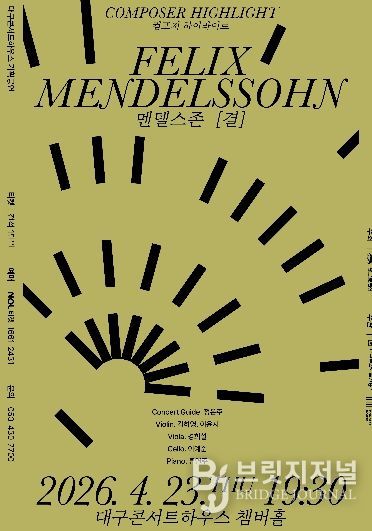 브릿지저널 김진석 기자 | 대구문화예술진흥원 대구콘서트하우스는 4월 23일 오후 7시 30분, 챔버홀에서 ‘컴포저 하이라이트 : 멘델스존, 결’을 개최한다.
