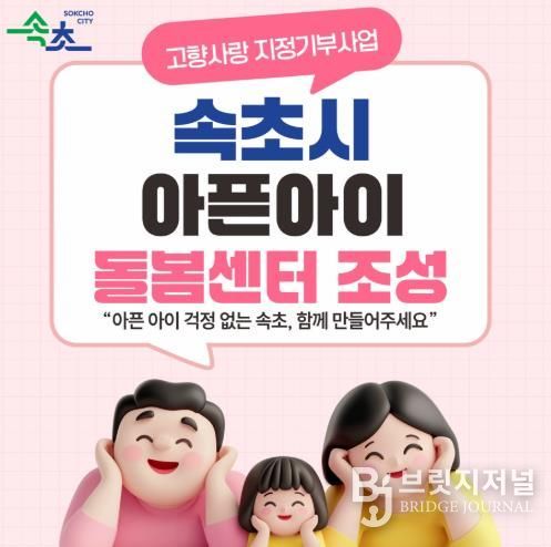 브릿지저널 윤나영 기자 | 속초시가 2026년 고향사랑기금 지정기부 1호 사업인 ‘아픈아이 돌봄센터 조성 사업’ 모금을 본격 추진하고, 기부 참여 확대를 위한 홍보 이벤트를 함께 진행한다.