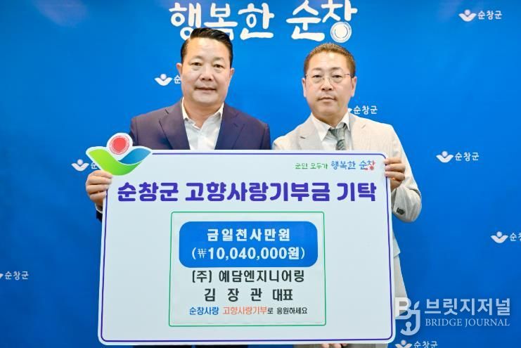 브릿지저널 윤나영 기자 | 순창군은 10일 (주)예담엔지니어링 김장관 대표가 고향사랑기부금 1,004만원을 기탁하며 순창에 대한 각별한 애정을 전했다고 밝혔다.