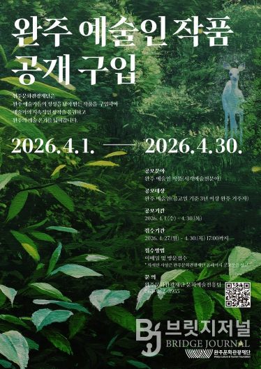 브릿지저널 윤나영 기자 | (재)완주문화관광재단(이사장 유희태)은 지역 미술 시장 활성화와 예술인의 안정적인 창작 환경 조성을 위해 ‘2026 완주 예술인 작품 공개 구입’사업을 실시한다.