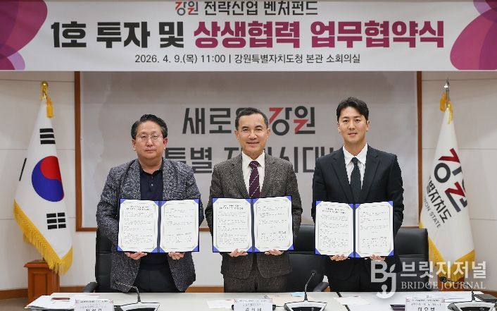 브릿지저널 윤나영 기자 | 강원특별자치도는 4월 9일, 도청 본관 회의실에서 강원 미래산업을 견인할 [강원 전략 산업 벤처펀드]의 첫 번째 투자기업으로 기능성 바이오 소재 기반 사료첨가제 제조기업인 [밸류라움바이오]를 선정하고 이를 기념하는 [강원 전략산업 벤처펀드 제1호 투자 및 상생협력 협약식]을 개최했다.