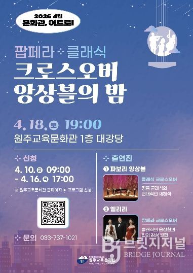브릿지저널 윤나영 기자 | 원주교육문화관(관장 용석태)은 관내 학생, 학부모, 지역 주민의 문화 향유 기회 확대를 위해 2026년 문화예술공연 ‘문화관, 아트로!’ 공연을 연중 운영한다.