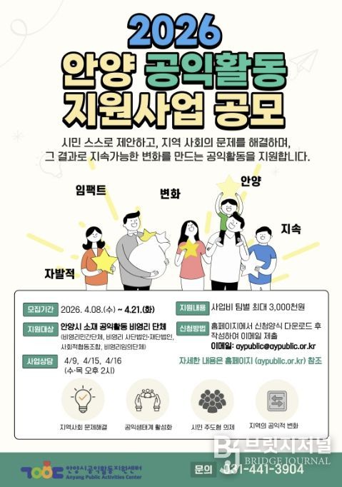 브릿지저널 김경미 기자 | 안양시공익활동지원센터는 지역의 문제를 창의적으로 해결하고 실질적인 사회적 변화를 만들어 갈 비영리단체 및 시민 모임을 모집한다고 10일 밝혔다. 이번 공모는 시민 주도의 공익 생태계를 구축하기 위해 ‘공익활동 지원사업’과 ‘커뮤니티기반 공익활동 협력사업’의 두 가지 트랙으로 운영된다.