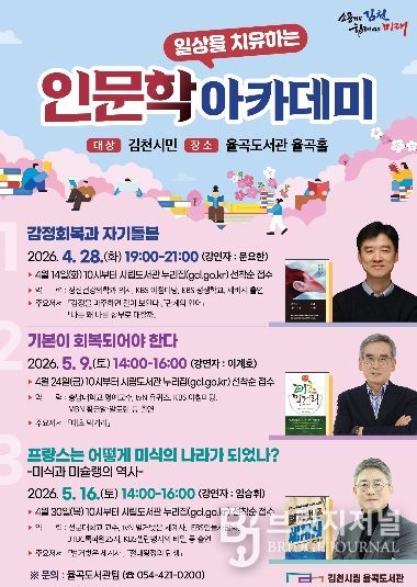브릿지저널 정보영 기자 | 김천시립율곡도서관(관장 이신기)은 시민들의 정서적 회복과 인문학적 소양 함양을 위해 오는 4월 28일부터 '일상을 치유하는 인문학 아카데미'를 운영하고 참가자를 모집한다고 밝혔다.