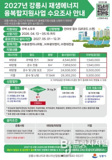 브릿지저널 윤나영 기자 | 강릉시는 기후위기 대응과 에너지 자립도 향상을 목표로 기후에너지환경부 주관 '2027년 재생에너지보급지원(융·복합지원사업)' 공모 신청을 위해 사전 수요조사를 한다.