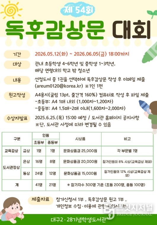 브릿지저널 김진석 기자 | 대구시교육청 산하 2·28기념학생도서관은 학생들의 사고력 확장과 문해력 향상을 위해 관내 초등학생(4~6학년) 및 중학생(1~3학년)과 동일 연령대 학교 밖 청소년을 대상으로 ‘제54회 독후감상문대회’를 개최한다.