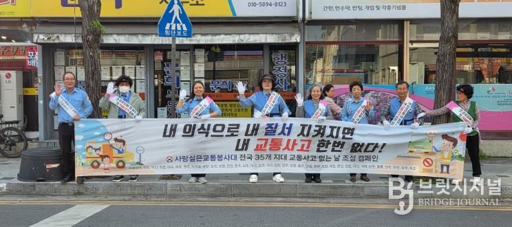 또한 사랑실은 교통봉사대 대원들은 퇴근시간을 맞아 교통이 혼잡한 모전교 인근 횡단보도에서 교통안전 캠페인을 펼쳤다.
