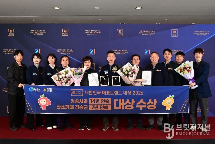 브릿지저널 정보영 기자 | 청송군은 14일 열린 ‘2026 대한민국 대표브랜드 대상 시상식’에서 사과 브랜드 부문 '청송사과'가 14년 연속 대상, 도시 브랜드 부문 '산소카페 청송군'이 7년 연속 대상을 수상했다고 밝혔다.