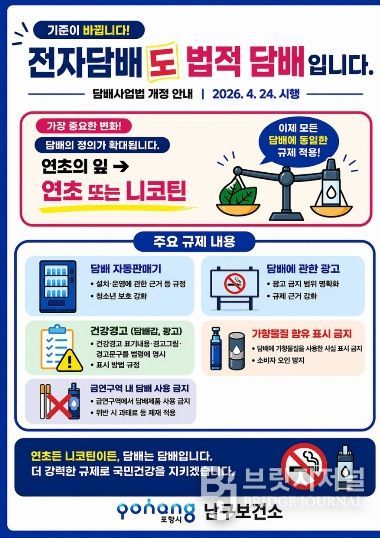 브릿지저널 정보영 기자 | 포항시는 개정된 담배사업법 시행에 따라 액상형 전자담배가 공식적인 규제 대상에 포함됐음을 알리고, 금연구역 내 흡연 금지 준수를 당부했다.