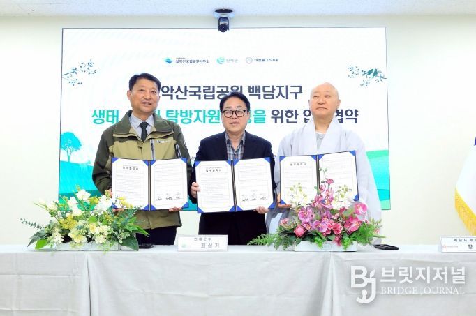 브릿지저널 윤나영 기자 | 인제군은 14일 설악산국립공원사무소에서 국립공원공단 설악산국립공원사무소, 대한불교조계종 백담사와 함께 ‘설악산 백담지구 생태·문화 탐방자원 조성’을 위한 업무협약(MOU)을 체결했다.