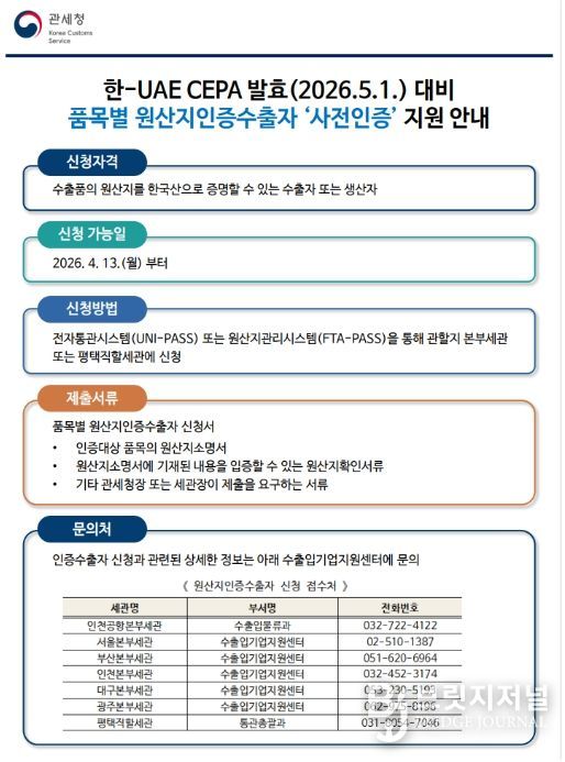 브릿지저널 정보영 기자 | 관세청은 오는 5월 1일 발효되는'한-아랍에미리트연합국(UAE) 포괄적경제동반자협정(CEPA)'를 우리 수출기업들이 발효 첫날부터 즉시 활용할 수 있도록, 4월 13일부터 품목별 원산지인증수출자 ‘사전인증’ 신청·접수를 시작했다.