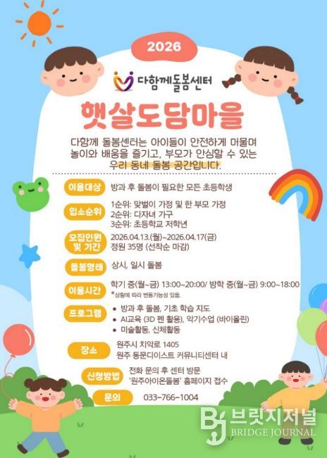 브릿지저널 윤나영 기자 | 원주시는 오는 20일부터 관설동 동문 디 이스트 아파트 단지 내 ‘원주시 다함께돌봄센터 햇살도담마을’ 운영을 시작한다.