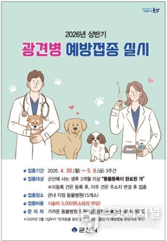 브릿지저널 윤나영 기자 | 군산시는 4월 20일부터 5월 8일까지 3주간 관내 동물병원 15개소에서 상반기 광견병 예방접종을 실시한다고 밝혔다.