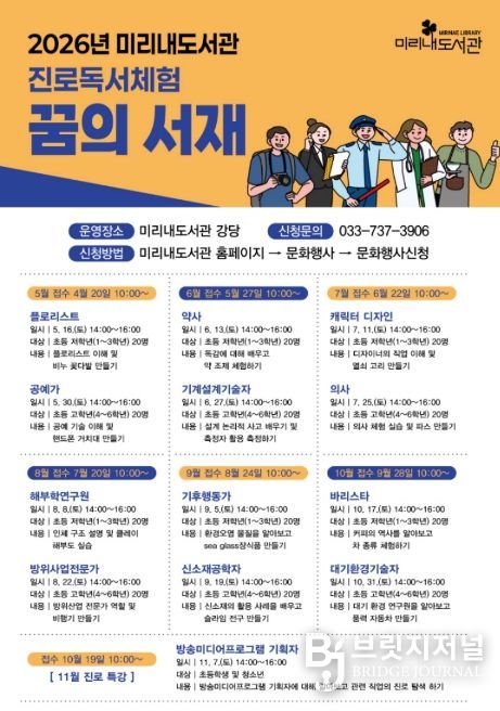 브릿지저널 윤나영 기자 | 원주시 미리내도서관은 관내 학생들의 자기 주도적 진로 탐색을 돕기 위해 5월 9일부터 11월 7일까지 미리내도서관과 샘마루도서관에서 진로 독서 체험 프로그램 ‘꿈의 서재’를 운영한다.