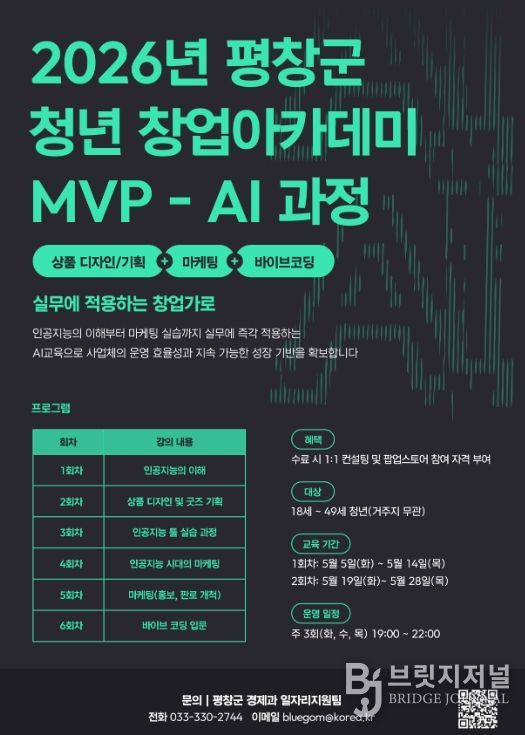 브릿지저널 윤나영 기자 | 평창군은 강원특별자치도 공모사업인 '2026년 지역산업 맞춤형 일자리 창출 지원사업'으로 ‘청년 창업아카데미(MVP)-AI 과정’을 본격적으로 운영한다.