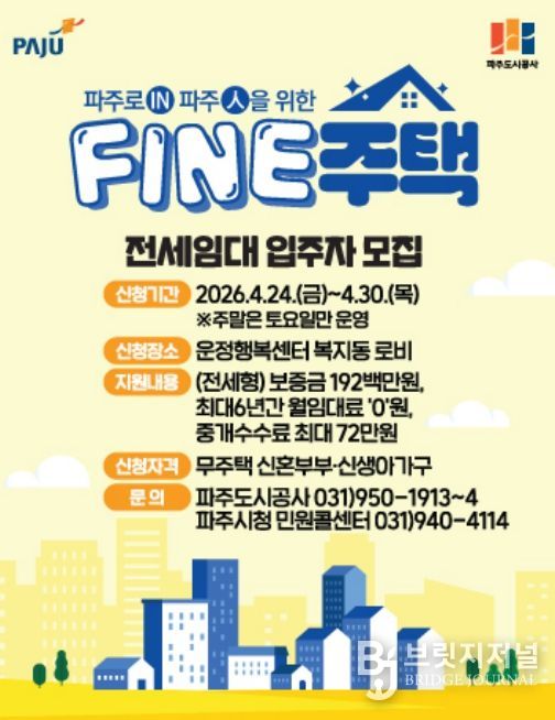 브릿지저널 김경미 기자 | 파주도시공사는 신혼부부·예비신혼부부 및 신생아가구 등을 대상으로 월 임대료 ‘0원’(최대 6년 지원)의 전세임대주택 입주자 모집을 공고했다고 16일 밝혔다.
