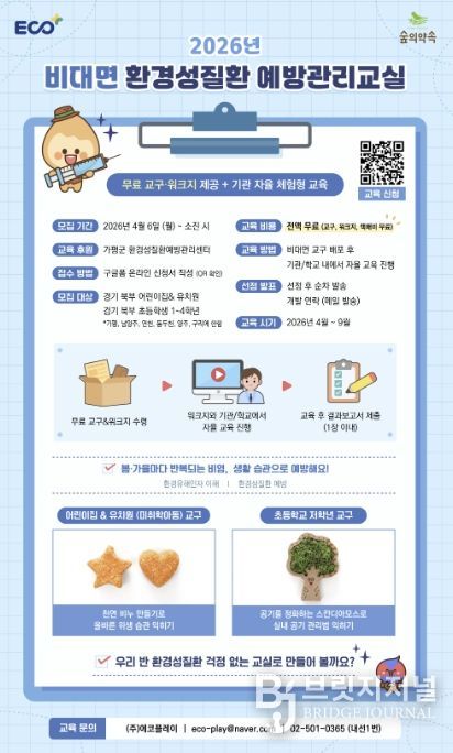 브릿지저널 김경미 기자 | 가평군 환경성질환예방관리센터 ‘숲의 약속’이 어린이들의 건강한 생활 습관 형성을 돕기 위해 ‘2026년 비대면 환경성질환 예방관리교실’ 참여 기관을 모집한다.