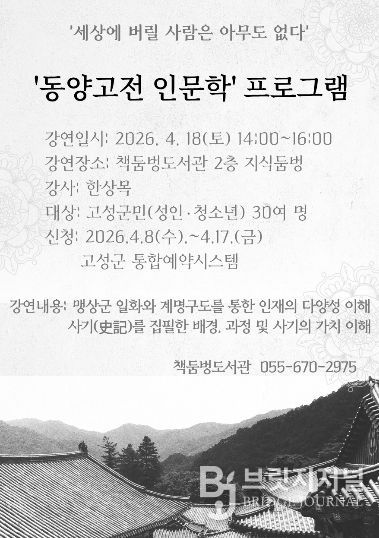 이와 함께 책둠벙도서관은 오는 4월 18일 오후 2시부터 4시까지 도서관 2층 지식둠벙에서 ‘2026년 동양고전 인문학 프로그램’을 운영한다.