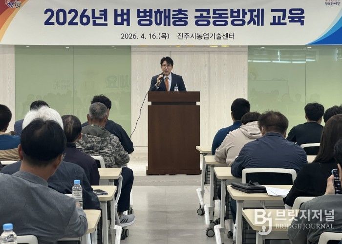 브릿지저널 김경미 기자 | 진주시는 16일 오후 농업기술센터에서 벼 병해충 피해를 최소화하고 체계적인 공동방제를 추진하기 위해 ‘2026년 벼 병해충 공동방제 교육’을 실시했다고 밝혔다.