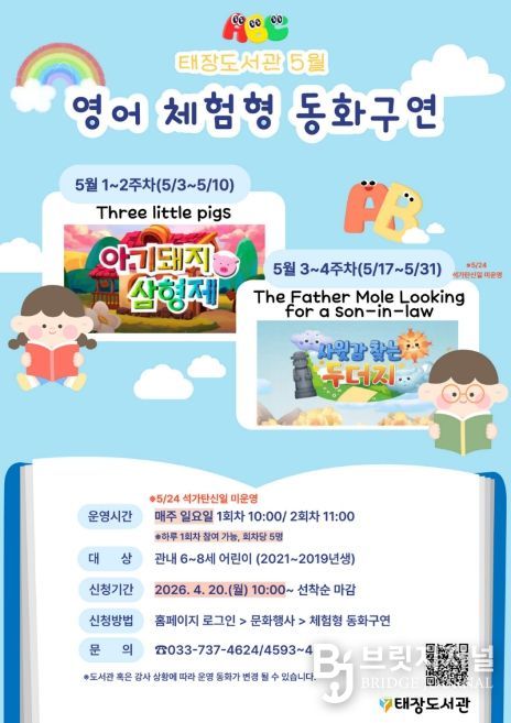 5월에는 ▲아기 돼지 삼형제(Three little pigs) ▲사윗감 찾는 두더지(The father mole looking for a son-in-law) 등 아이들에게 친숙하고 사랑받는 동화를 준비했다. 매주 일요일 오전 10시와 11시 2회차로 운영되며, 참가비는 무료다.