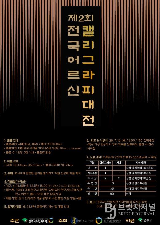 브릿지저널 정보영 기자 | 천태종복지재단 산하 영주시노인복지관은 어르신들의 문화예술 참여 기회를 확대하고 창작 활동을 지원하기 위해 '제2회 전국 어르신 캘리그라피 대전'을 개최한다.