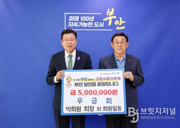 브릿지저널 윤나영 기자 | 부안군은 지난 16일 수도권에서 활발히 활동하며 고향의 명예를 드높이고 있는 기업인 및 전문가 모임인 재경부안군향우회 우금회(회장 박희원)가 고향 부안의 발전을 염원하며 고향사랑기부금 500만 원을 기탁했다고 밝혔다.