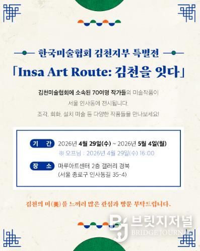 브릿지저널 정보영 기자 | 김천시는 4월 29일부터 5월 4일까지 6일간 서울 마루아트센터 2층 갤러리 경북에서 한국미술협회 김천지부 특별전 ‘인사 아트 루트(Insa Art Route): 김천을 잇다’를 개최한다고 밝혔다.