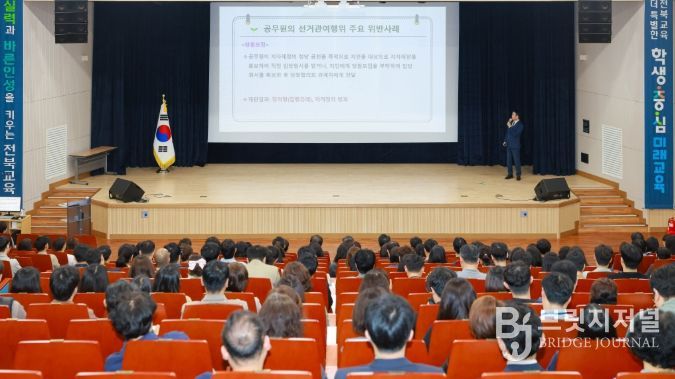 브릿지저널 윤나영 기자 | 전북특별자치도교육청은 6월 3일 치러지는 전국동시지방선거를 앞두고 공무원의 정치적 중립 의무에 대한 이해를 높이고 선거 관련 위법행위를 사전에 예방하기 위해 17일 창조나래 시청각실에서 전 직원 대상 직장교육을 실시했다.