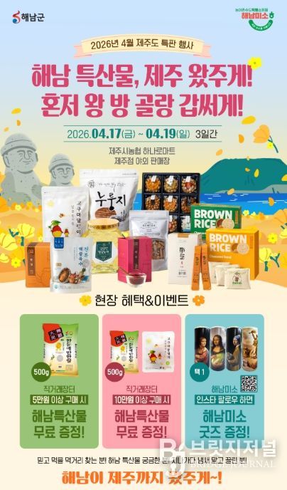 브릿지저널 김경미 기자 | 해남군은 바다 건너 제주 소비자를 찾아 오는 17일부터 19일, 3일간 제주시농협 하나로마트 제주점 야외특설매장에서 농수특산물 직거래장터를 운영한다. 이번 행사에서는 해남고구마를 비롯해 잡곡류, 차류, 가공식품 등 100여종의 다양한 농수특산물을 합리적인 가격으로 선보일 예정이다.