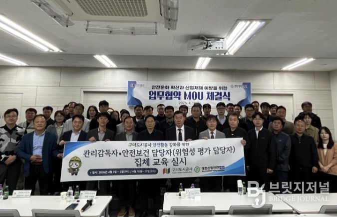 브릿지저널 정보영 기자 | 구미도시공사는 대한산업안전협회와 산업현장 안전문화 확산 및 근로자 산업재해 예방을 위한 업무협약(MOU)을 체결하고, 안전 중심의 경영체계 구축을 위한 협력에 나섰다.