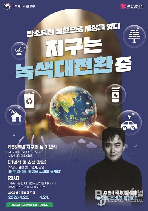 브릿지저널 윤나영 기자 | 부산시는 '제56주년 지구의 날(4월 22일)'을 맞아 오늘(20일)부터 24일까지 '제18회 기후변화주간'을 운영하고, '지구는 녹색대전환 중. 탄소중립 실천으로 세상을 잇다'를 주제로 다양한 행사를 개최한다고 밝혔다.