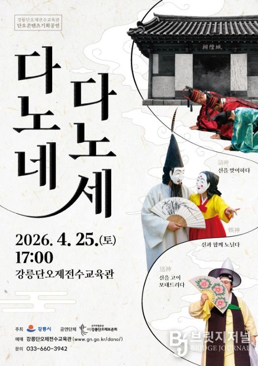 브릿지저널 윤나영 기자 | 강릉시 강릉단오제전수교육관은 강릉단오제의 전승발전과 의미를 쉽게 전달하기 위해 오는 25일 오후 5시 강릉단오제전수교육관 공연장에서 '다노네, 다노세' 공연을 개최한다.