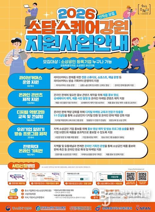 브릿지저널 윤나영 기자 | 디지털커머스 전문기관 ‘소담스퀘어 강원’이 도내 소상공인의 성공적인 온라인 시장 진출과 디지털 전환을 돕기 위해 ‘2026년도 지원사업’ 참여 업체를 지난 13일부터 연중 상시 모집 중이라고 밝혔다.