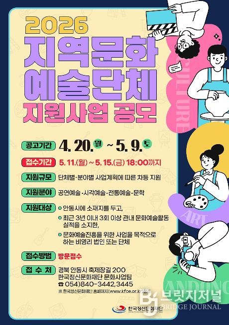 브릿지저널 정보영 기자 | 안동시 한국정신문화재단은 5월 11일부터 5월 15일 18시까지 관내 문화예술단체를 대상으로 ‘지역문화예술단체 지원사업’ 참여단체를 공개 모집한다.
