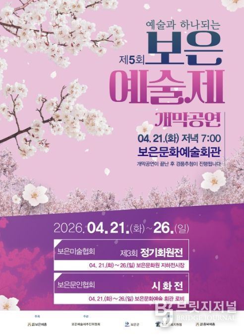 브릿지저널 김경미 기자 | 충북 보은군은 지역 예술인과 군민이 문화로 소통하고 화합하는 ‘제5회 보은예술제’를 21일부터 26일까지 6일간 보은문화예술회관 및 보은문화원 일원에서 개최한다고 밝혔다.