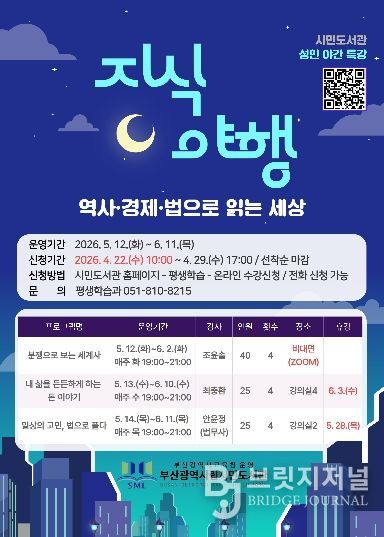 브릿지저널 윤나영 기자 | 부산광역시립시민도서관은 오는 5월 12일부터 6월 11일까지 낮 시간 도서관 이용이 어려운 성인 90명을 대상으로 도서관 강의실과 온라인(ZOOM)을 통해 ‘지식 야행’특강을 운영한다.