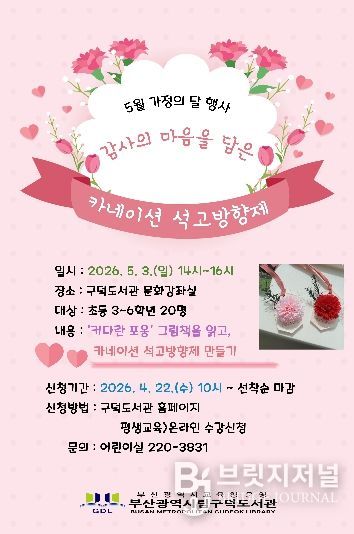 브릿지저널 윤나영 기자 | 부산광역시립구덕도서관은 다음달 3일 도서관 문화강좌실에서 초등학교 3~6학년 20명을 대상으로 ‘감사의 마음을 담은 카네이션 석고방향제’ 체험을 운영한다.