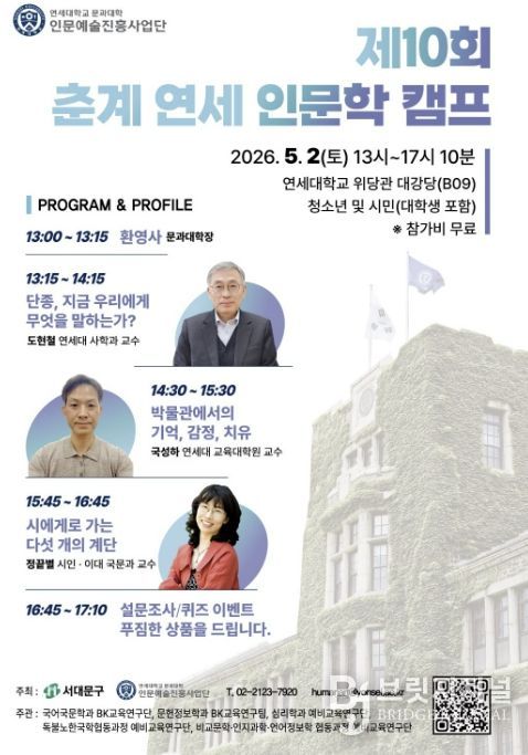 브릿지저널 김경미 기자 | 서대문구가 연세대학교 문과대학과 공동으로 5월 2일 오후 1시부터 5시 10분까지 연세대 위당관 대강당(B09호)에서 ‘제10회 연세 인문학 캠프’를 개최한다.