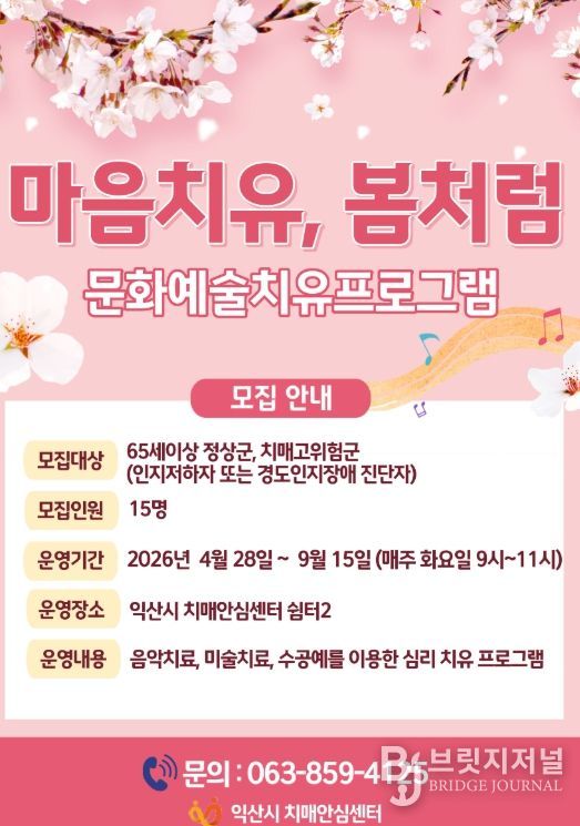 브릿지저널 윤나영 기자 | 익산시는 보건소 치매안심센터에서 고령층 문화예술 치유프로그램 '마음치유, 봄처럼' 참여자 15명을 선착순으로 모집한다고 21일 밝혔다.