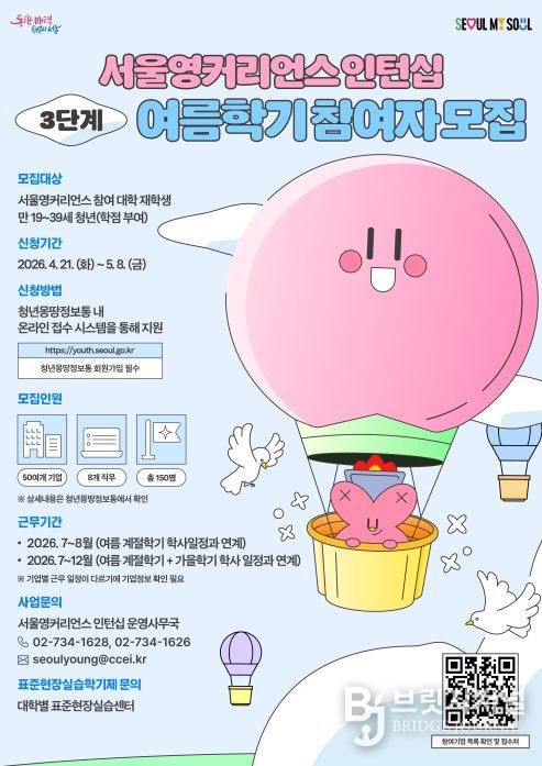 브릿지저널 김경미 기자 | 서울시가 국내 최초로 도입한 초기 청년 대상 단계별 취업 지원책인 ‘서울영커리언스 사업’의 3단계, 인턴십의 여름학기 참여자 150명을 모집한다고 밝혔다.